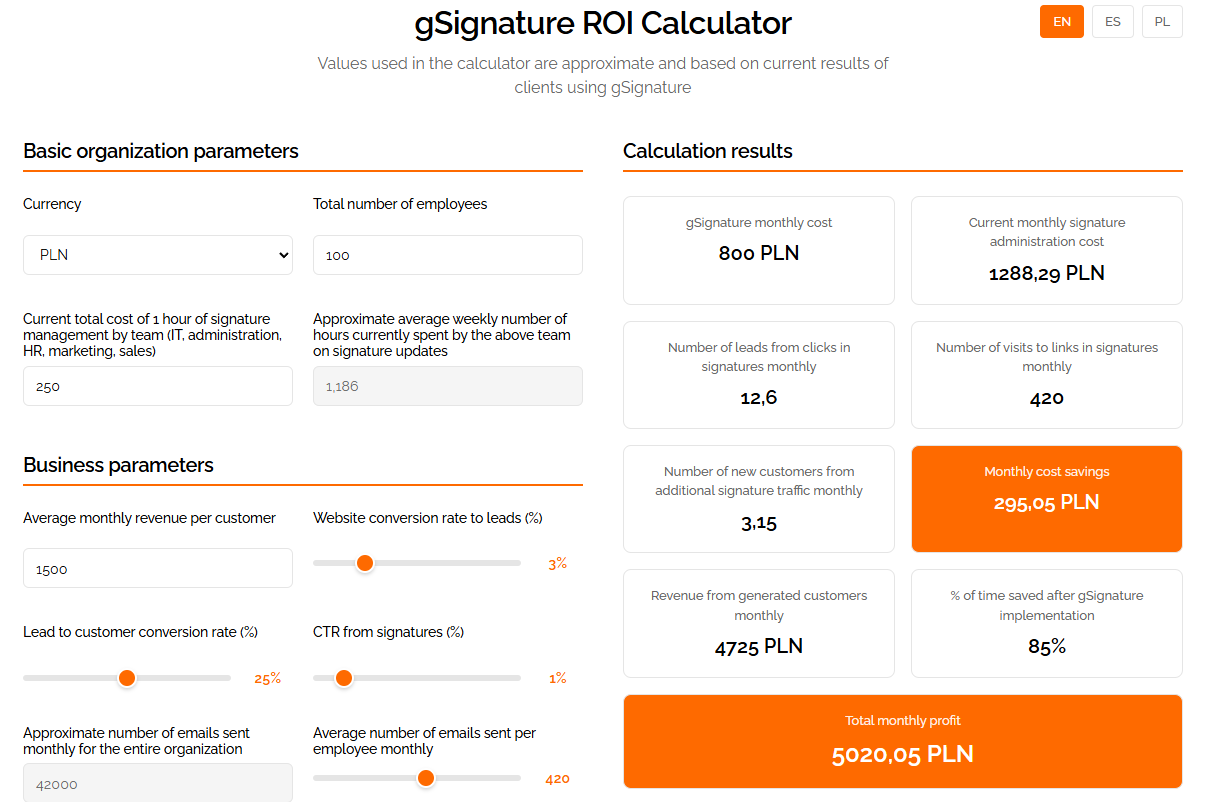The calculator uses the input data visible in the panel (sample values based on the average results of gSignature customers). You can overwrite them with real numbers from your company at any time.