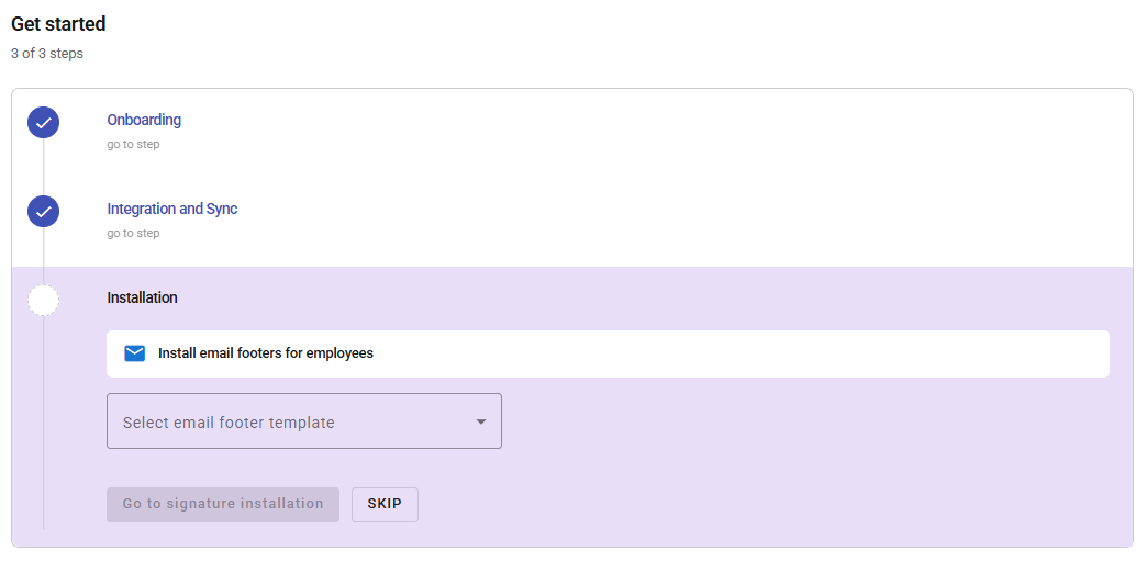 - Signature installation – the final step that activates personalized HTML email signatures for your entire organization.