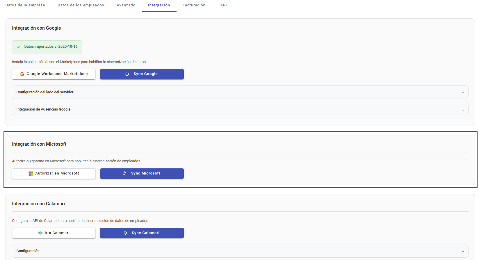La nueva «Autorizar y sincronizar con Microsoft» la función permite a los administradores sincronizar los datos de los empleados con gSignature con un solo clic. El proceso de integración está diseñado para ser intuitivo y no requiere una configuración técnica avanzada.