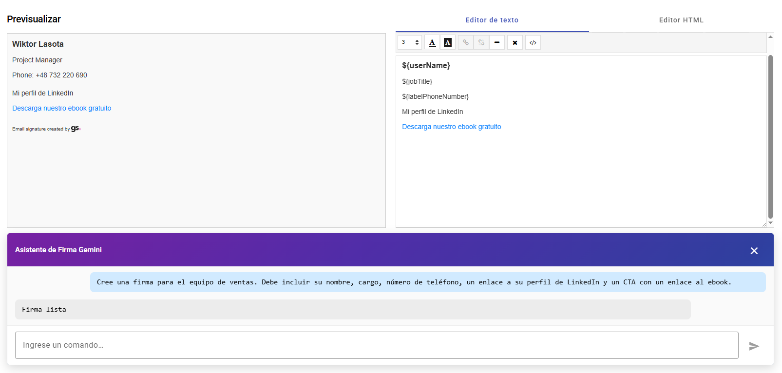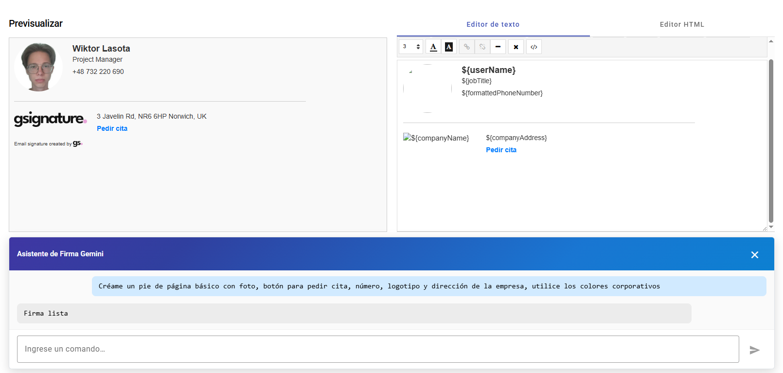 ¿Quieres actualizar rápidamente los datos de una firma o añadir variables dinámicas sin buscarlas en el código HTML? Ahora es posible. Con la nueva función de IA del editor, puedes realizar personalizaciones sin saber la codificación.