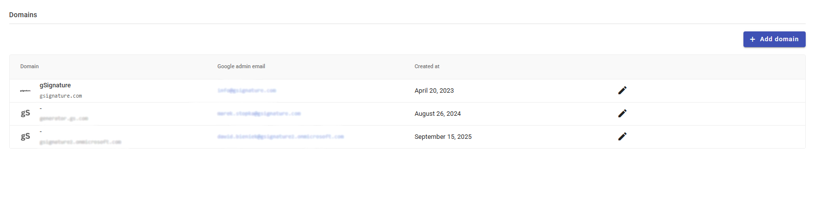From now on, gSignature administrators can add, edit, and manage domains and subdomains associated with their organization—without having to access the Google Workspace panel. The new Domain Management section allows you to assign multiple company domains (e.g., company.com, marketing.company.com, support.company.com) to a single main account in gSignature.