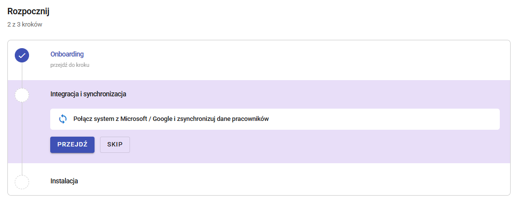 - Dodanie pracowników – do wyboru jest integracja z Google Workspace lub Microsoft 365/Exchange Online, a dla organizacji z restrykcyjnymi politykami IT dostępny jest import z pliku CSV.