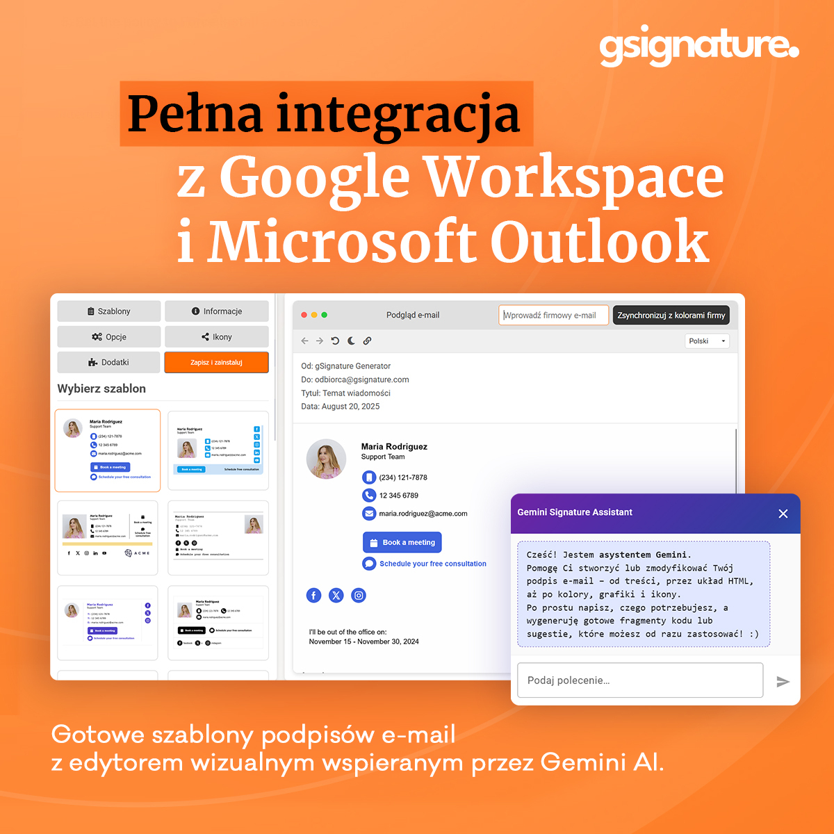 Kreatywne, ale trzymające brand? W edytorze gSignature zmieniasz układ, bloki treści, ikony, CTA i bannery bez grzebania w kodzie. Wspierający moduł AI (asystent w edytorze) potrafi: